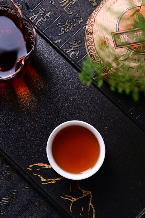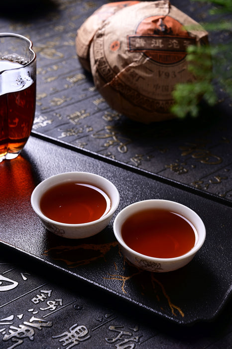 This is a classic Ripe tea blend, called "V93", it was first released in 2005 and quickly became one the most expensive ripe teas on the market. To this day the 2005 and 2006 V93 Ripe productions have commanded very high prices due to the fact that this is one of the most sought after Ripe teas for everyday drinking. The 2007 is no slouch either, being smooth and full in the mouth. It is fermented just enough to break down the bitterness of raw pu-erh while lightly fermented enough to preserve the stimulating cha qi and hui gan of a raw pu-erh. After-taste is sweet and thick.