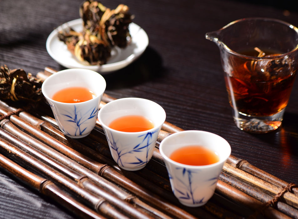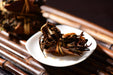 "Three Treasure" tea is a unique Fuding specialty tea that consists of Gong Mei Fuding White Tea, dried tangerine peel, and rice stalk. The white tea after picking is packed into a tangerine peel and then tied close with a glutinous rice stalk. The tea is then sun-dried for a an afternoon and then shade-dried for a week or longer before being individually packed into handy single serving packs.